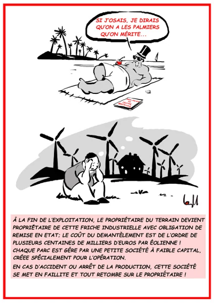 Les nuisances visuelles, auditives, écologiques sont nombreuses, sans compter la dévaluation de l’immobilier! Des conflits peuvent aussi apparaître entre propriétaires terriens qui font subir ces nuisances et les habitants qui les subissent.